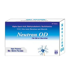 Descriprion: NEUTRON OD TABS 30'S Dietary supplements containing Alpha Lipoic Acid to support healthy nerves and help protect nerves from damage. Also helps to control blood sugar levels and reduce pain, burning, itching, tingling and numbness in people who have nerve damage as a result of diabetes. ...