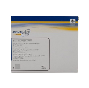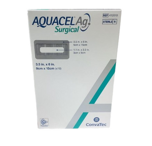 AQUACEL® Ag SURGICAL cover dressing Combination dressing with a mix of skin-friendly hydrocolloid technology for comfort during body movement, and proprietary Hydrofiber® Technology with ionic silver to help manage serosanguinous fluid. Cover layer of polyurethane film provides a viral, waterproof and bacterial barrier (when intact and with no leakage), for a high-performance dressing. DIRECTIONS FOR USE: Do not use the device if the packaging is damaged or open prior to use and dispose of the device according to local regulations. Before applying the dressing cleanse the wound area with an appropriate wound cleanser and dry the surrounding skin....