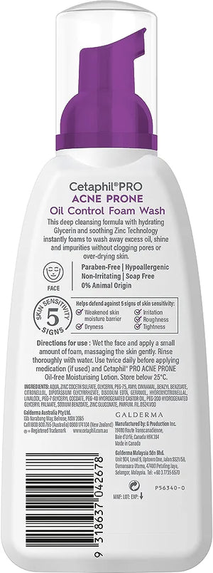 CETAPHIL PRO ACNE PRONE OIL CONTROL FOAM WASH 236ml: Deep cleansing formula, with hydrating glycerin and soothing zinc technology, instantly foams to gently remove pore clogging impurities and 99% of...