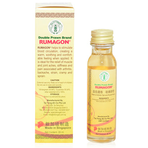 Product Profile:Double Prawn Brand Rumagon® liniment is a uniquely developed formulation which contains natural essential oils. It helps to stimulate blood circulation? creating a warm? soothing and comfortable feeling when applied....
