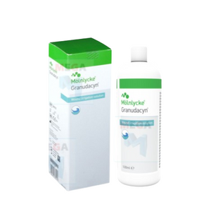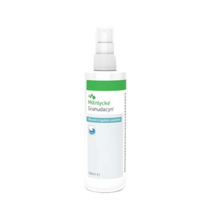Molnlycke Granudacyn Wound Irrigation Solution 500ml Granudacyn is a wound irrigation solution for cleansing and moisturising acute, chronic and contaminated wounds as well as for superficial and partial thickness burns. Hypochlorous acid (HOCl) ensures safe preservation and makes Granudacyn a reliable wound irrigation solution. HOCl prevents the proliferation of Gram+ and Gram- bacteria including; MRSA, ORSA, VRSA, VRE, viruses, fungi and spores....