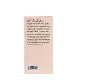 Kordels Acid Free C 1000mg Description and Benefits Vitamin C is an important nutrient that supports the immune system. It is also used in the development of collagen to maintain strong bones, teeth and gums. Because the body does not produce Vitamin C, it must be derived from the diet. It is an important supplement for good health, especially when dietary intakes are low, or when increased levels are needed due to stressful conditions or other factors. Kordels Acid Free C contains Calcium Ascorbate, the non-acidic form of Vitamin C buffered with Calcium. Kordels Acid Free C contains bioflavonoids that supports absorption of vitamin C. Ideal for people with sensitive stomachs who cannot tolerate the acidic form of Vitamin C (Ascorbic Acid). Dosage One to two tablets a day, after a meal, or as directed by a healthcare professional. Note : Suitable for vegetarians Formulations Calcium Ascorbate 1000mg Calcium (from ascorbate) 90mg Citrus Bioflavonoid 100mg Rutin 50mg Hesperidin 25mg