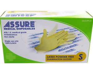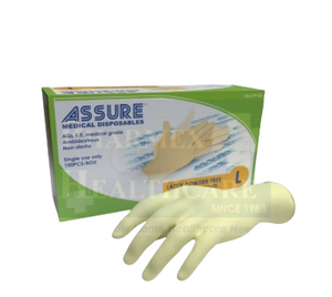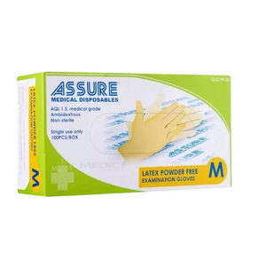 Product details of ASSURE Latex Exam Gloves Disposable and Powder Free (100pcs/box) Manufactured in the highest required quality of AQL 1.5 Acceptable Quality Level (AQL) Made from 100% Natural Rubber Latex....
