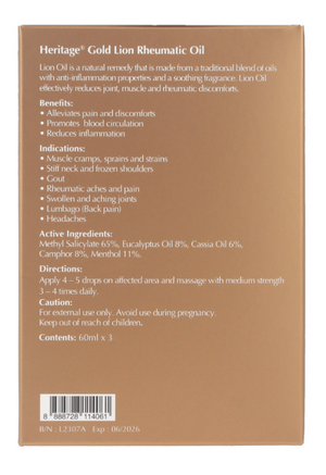 Heritage Gold Lion Rheumatic Oil(60ml): A natural remedy made from a traditional blend of oils with anti-inflammation properties and a soothing fragrance, the Lion Oil effectively reduces muscle and joint...
