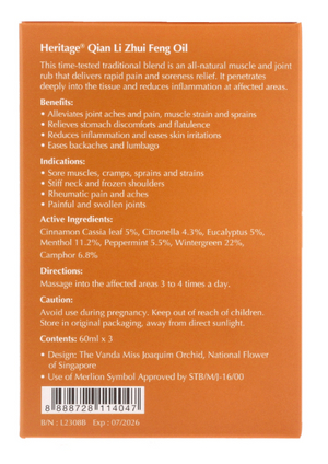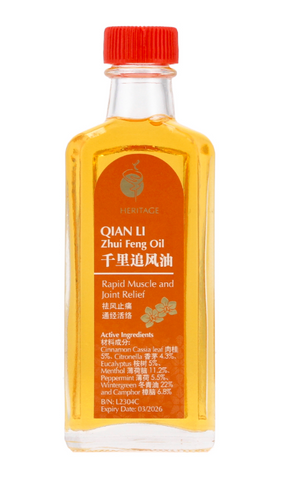 Heritage Qian Li Zhui Feng Oil (60ml): A traditional blend of Nutmeg, Eucalyptucs, Cinnamon, Pine, Menthol and Camphor, this time-tested blend is an all-natural muscle and joint rub to reduce...