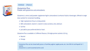 Description Oral nutritional supplement powder to be reconstituted with fluid. High in glutamine and antioxidants (vitamins C and E, beta-carotene, zinc, selenium), free from lactose, free from gluten, low in...
