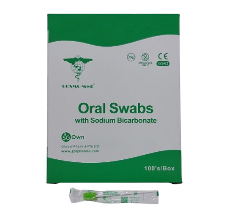 Description: 100 individually packed oral swabs Treated with sodium bicarbonate 16 cm in length Each swab with sodium bicarbonate comes in individual pack Gently cleans, moistens and refreshes mouth, teeth and gums